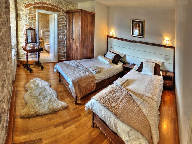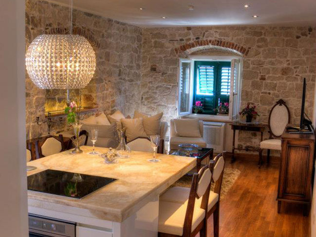 The interior of the apartment is carefully designed with attention to detail including antique and stylish handmade furniture and a preserved authentic stone wall. It also includes a wine bar with a selection of Dalmatian wines.